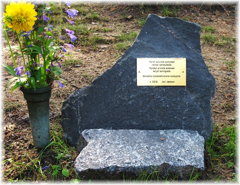 Jarin laatima kyltti "Tuntemattoman uurnahaudalle"